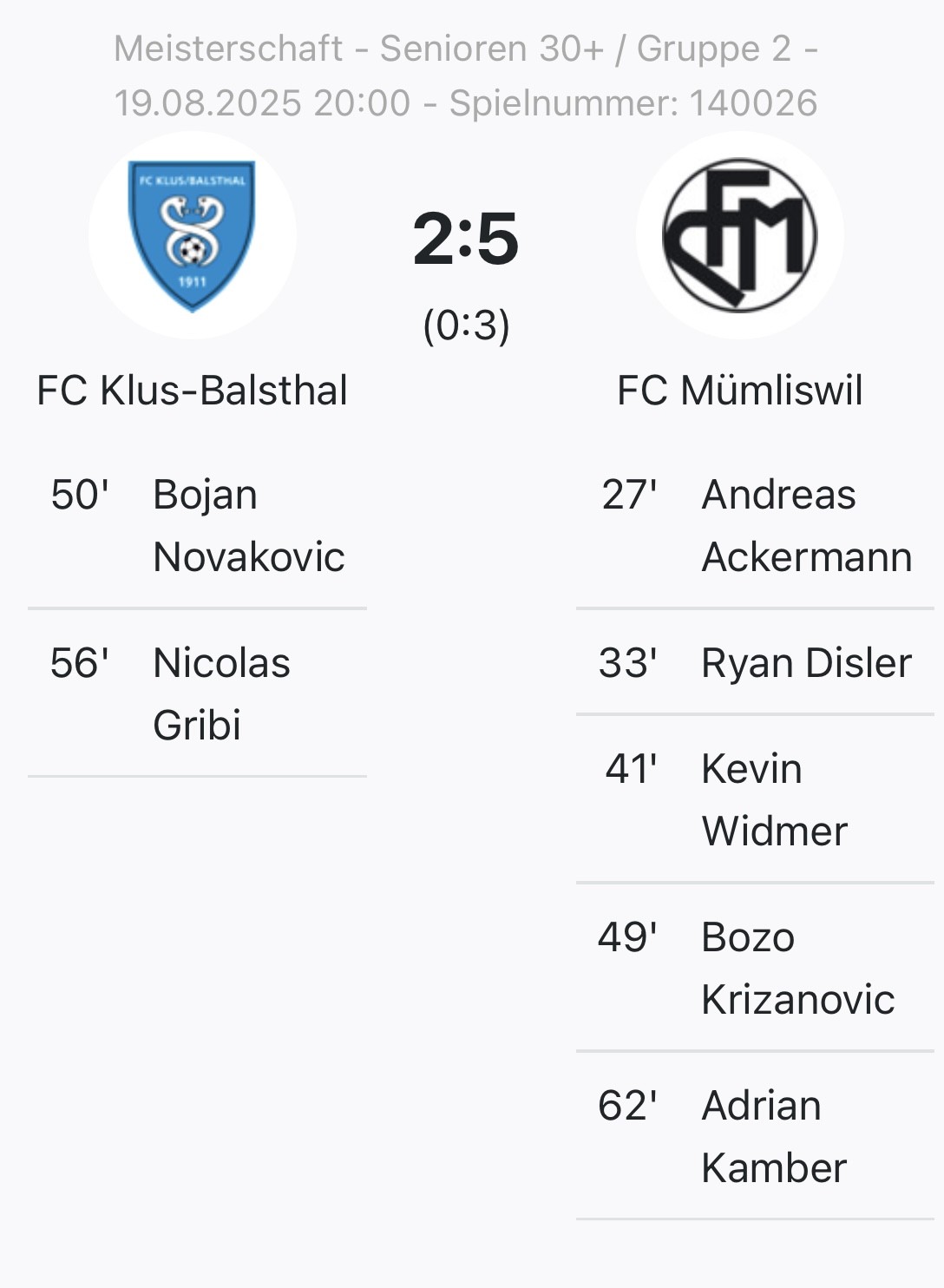 Die zweite Halbzeit begann mit einem frühen 0:3. Robin Disler legte uneigennützig auf K. Widmer ab, der im Strafraum locker einschieben konnte. Danach folgten jedoch zehn sackschwache Minuten, die man am besten schnell vergisst. Zwei Konter brachten die Heimherren auf 2:3 heran. In dieser Phase konnte man froh sein, nicht noch den Ausgleich kassiert zu haben. Erst danach fing sich das Team wieder: B. Krizanovic per Kopf und Robin Disler in „Kevin-De-Bruyne-Manier“ per Elfmeter sorgten für den 2:5-Endstand. Alle waren erleichtert, dass der Reckenkiener diesmal auf seinen starken linken Fuss vertraute.